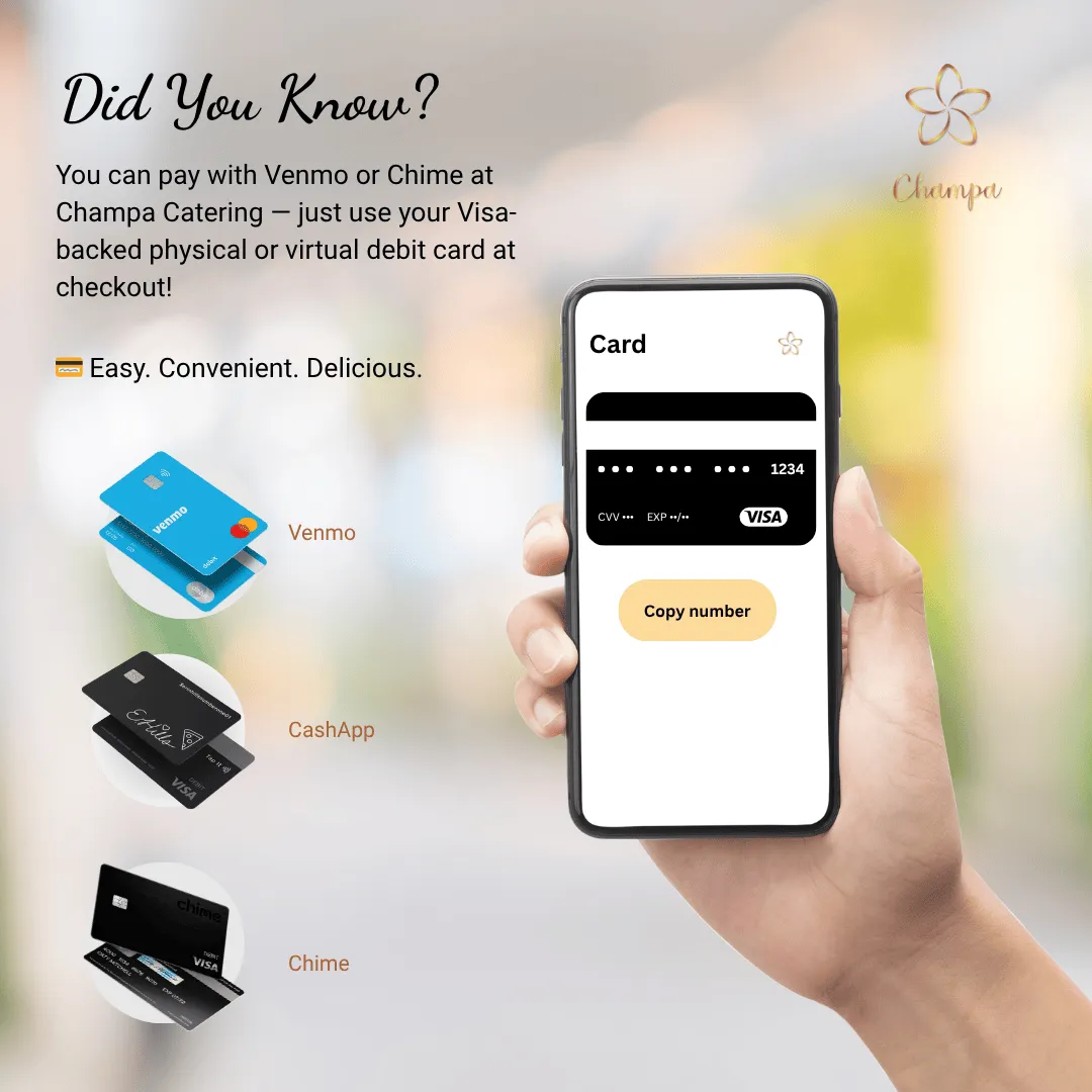 This information is provided solely as a resource in response to customer inquiries. Champa Catering is not affiliated with Venmo, Chime, Cash App, or any other financial service or third-party provider. We do not receive any compensation, referral benefits, or incentives from sharing the links or information on this page. These apps are just a few examples out of many available, and we do not endorse or recommend one over another. Please research and choose any financial service at your own discretion. Any account setup, card activation, or usage is solely between you and the respective company.